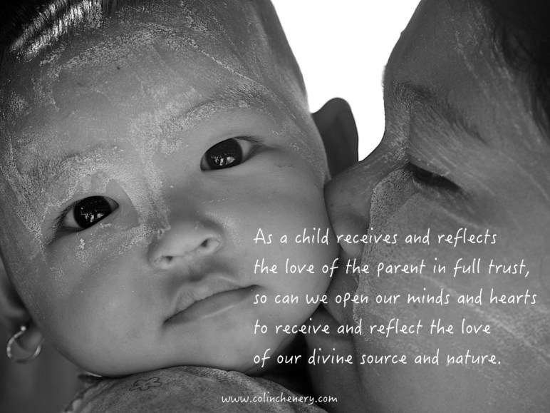 When we accept and embrace this life and world as unconditionally bestowed gifts, along with all their potential ideals and possibilities, then it follows that we embrace every moment. Valuing and appreciating these gifts will enrich our experience of them. A human child is conceived by the will and actions of its human parents co-creating with the divine source of the spark of life and consciousness. Likewise, when we are born of the Spirit of life and pure consciousness, we are progressively glimpsing ourselves as conceived by the Spirit and sharing its nature. Like the human child, it is for us as spiritual beings to be of the love of our divine parent and let our sense of the divine reveal our own divine nature. In personalizing and identifying with our divine source and parent, we become a reflection of our own experience of the beloved divine Father/Mother who is our living source and destiny.